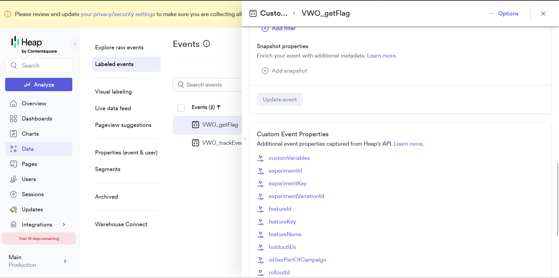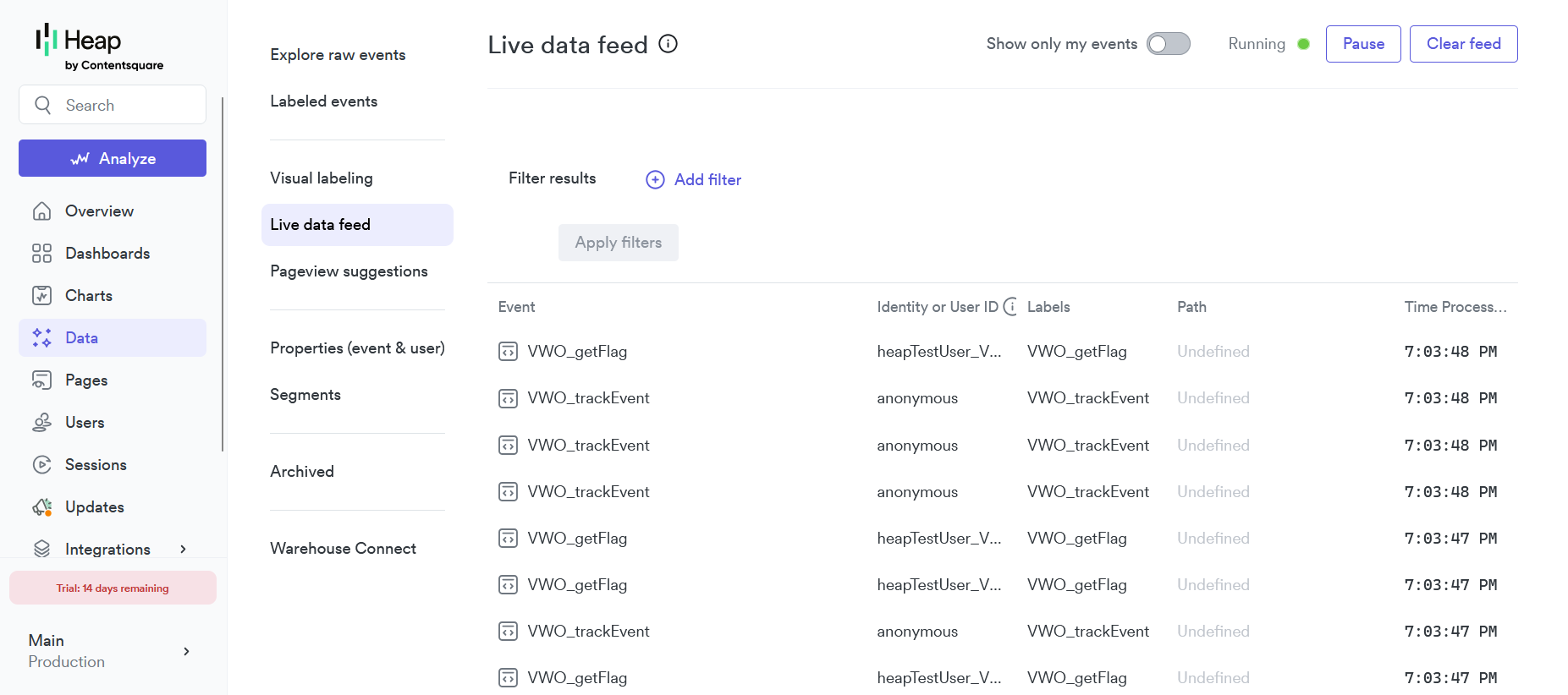 VWO Feature Experimentation (FE) sends feature-flag and event data to Heap. This allows you to see which feature flag variations users are exposed to directly within your Heap reports. By correlating user behavior with specific experiments, you can gain deeper, data-driven insights into the real impact of your feature rollouts and campaigns.
