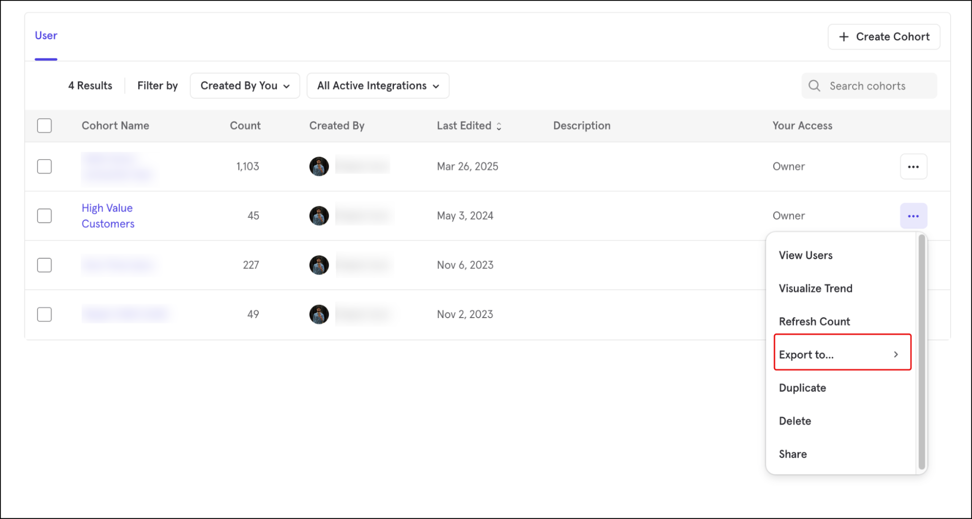 Click on the cohort’s menu and choose Export to → VWO.
