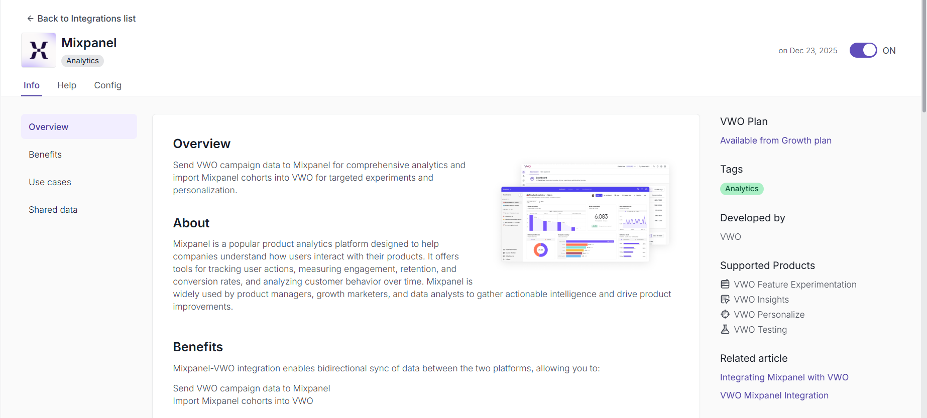 - Click on the Mixpanel integration and enable it by switching on the toggle. Once enabled, the Mixpanel screen within the VWO’s Integration section looks like this: