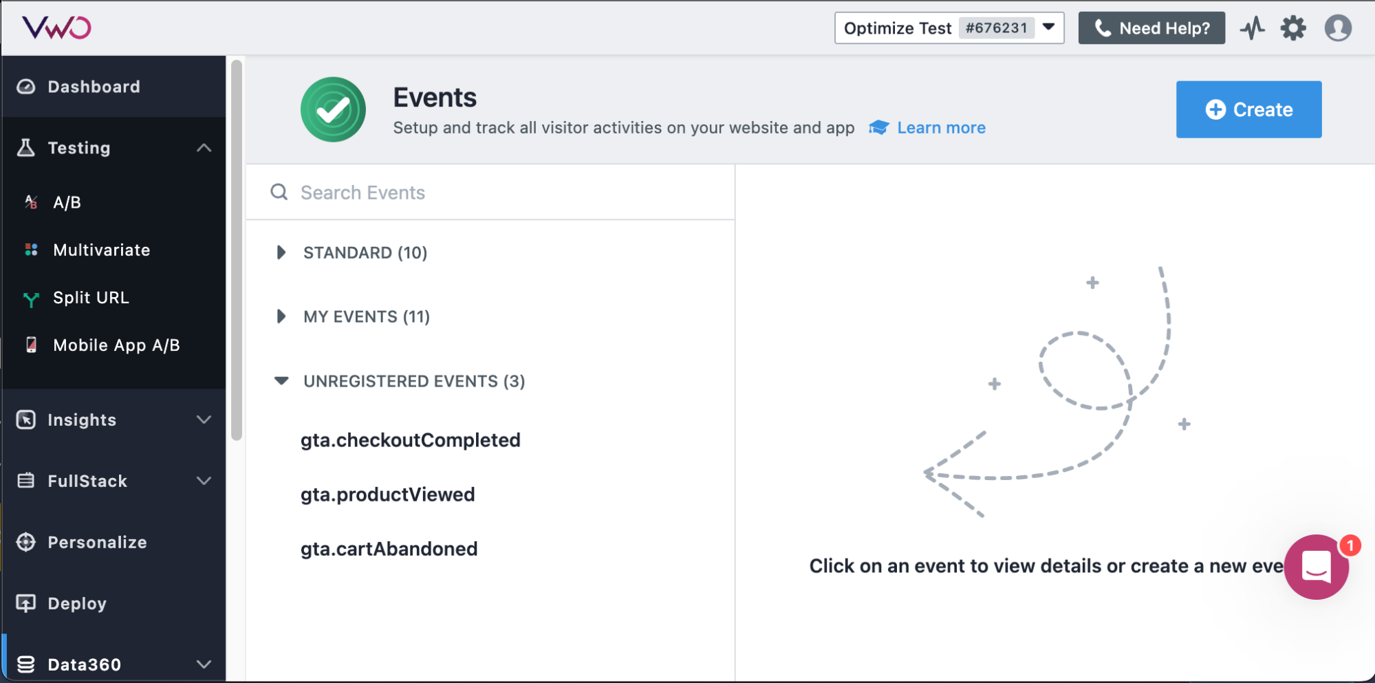 Now, your website events from GTM will be streaming into the UNREGISTERED EVENTS section under Events in your VWO Data360 module. You can use these events to set up your campaign triggers , create metrics , and target the visitors for your campaigns .