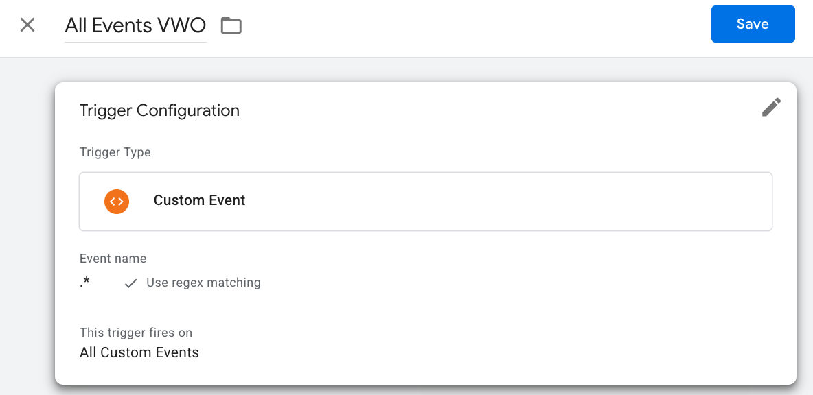We recommend using the following trigger settings to stream all the events to VWO. Configure your trigger settings as follows and click on Save: