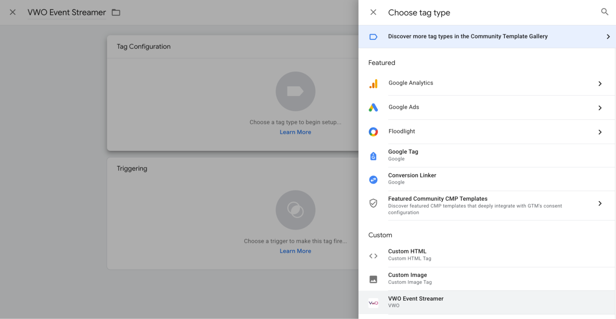 From the list of tags, under the Custom section, select the VWO Streamer tag.