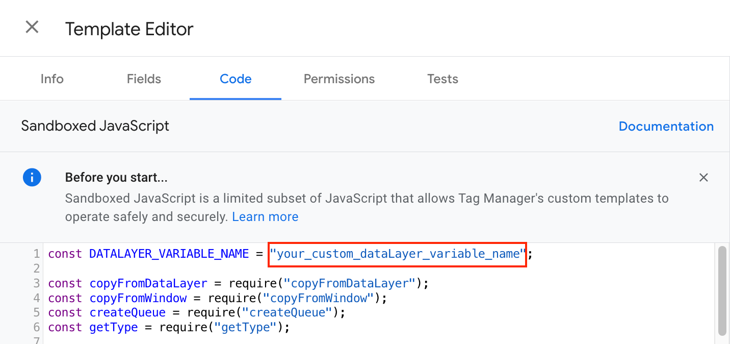 In the code, replace “dataLayer”, corresponding to const DATALAYER_VARIABLE_NAME, with your custom datalayer variable name and click Save.