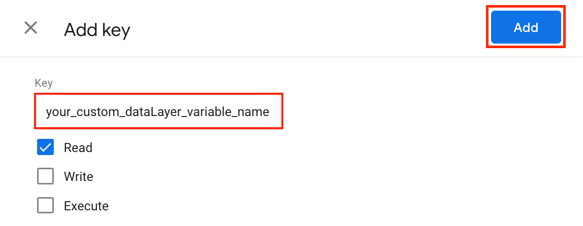 In the Key field, enter the name of your custom datalayer variable, select Read, and click Add.
