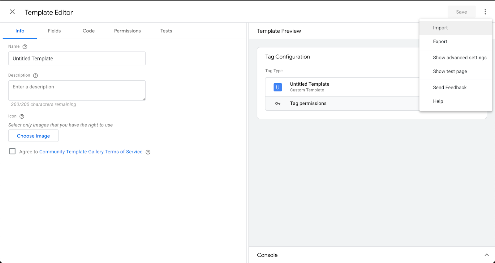 On the Template Editor page, click on the vertical ellipsis (⋮) and select Import.