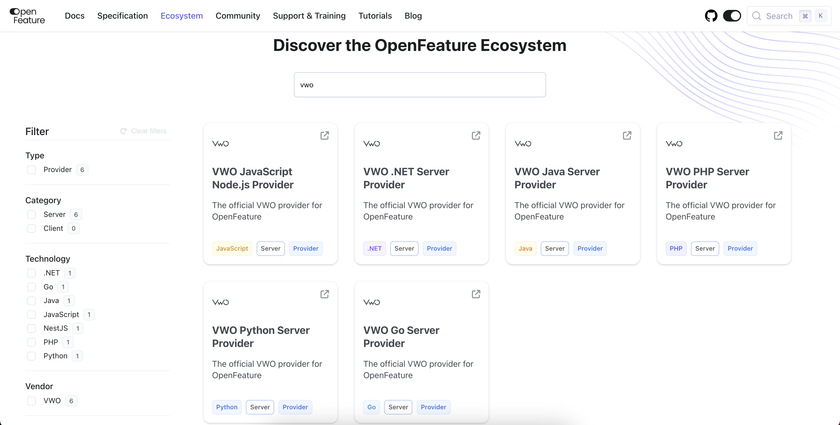 You can also explore our OpenFeature-compliant providers, officially listed in the OpenFeature Ecosystem. These providers enable seamless integration with the VWO Feature Experimentation (FE) product and are designed to support a variety of platforms and deployment needs.